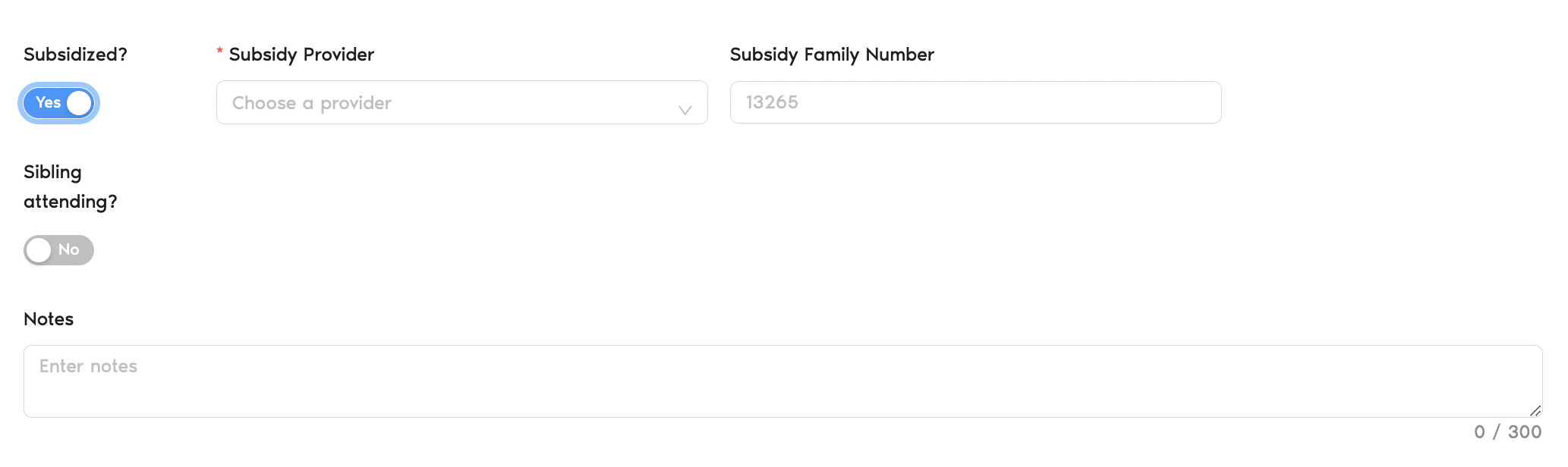 In the last section of the registration form, families are asked to indicate if they receive subsidy. If so, click on the tab to switch to "Yes" and provide the subsidy provider and subsidy file number.