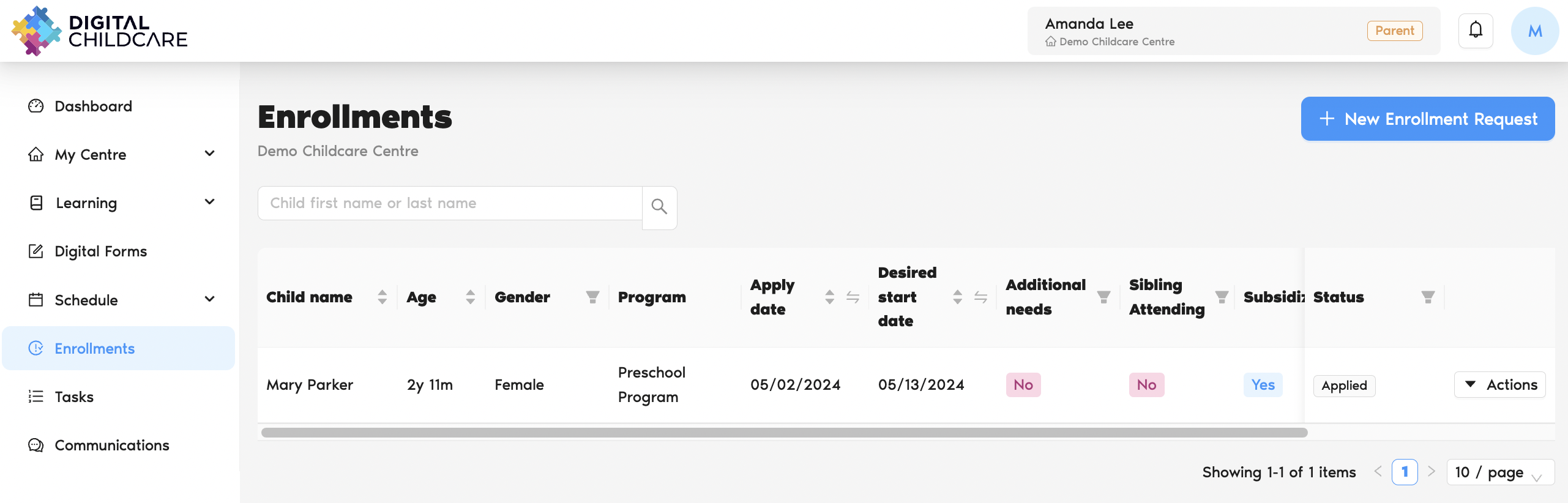 Once the enrollment request is submitted, the child's information will be displayed in the enrollments section.