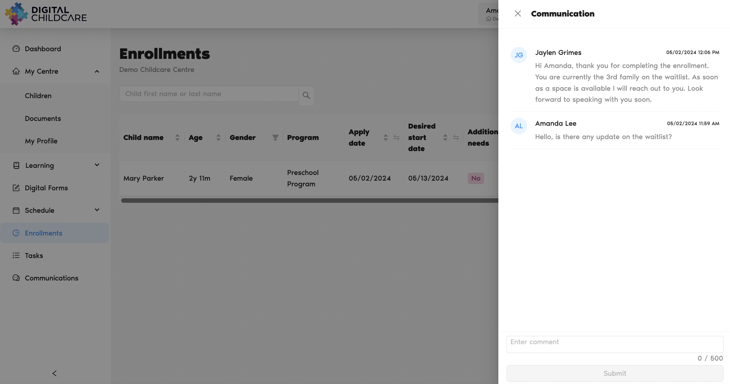 By clicking 'View Communications', families can send and receive messages directly to the centre admin.